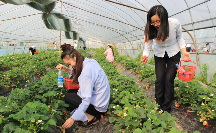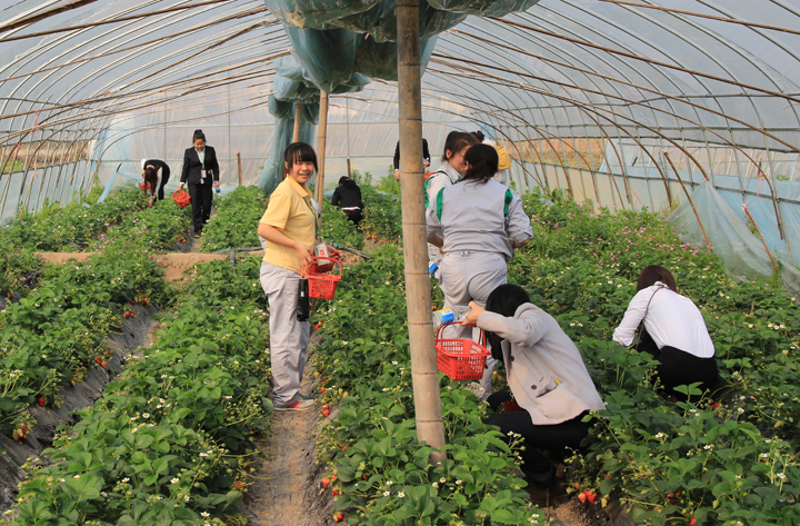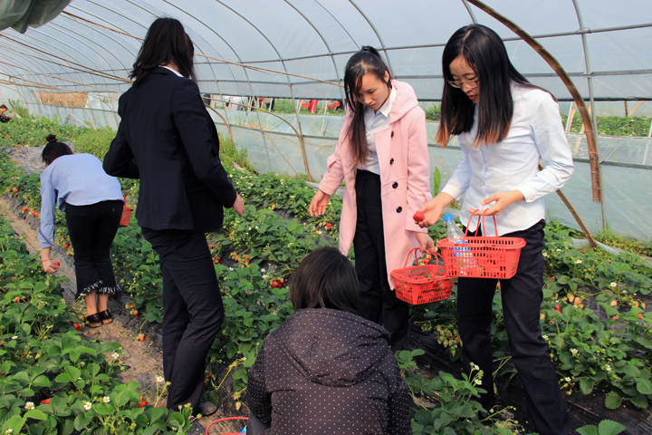 平日里我們總吃著菜市場、超市買來草莓,今天我們來一場身體力行的摘草莓。一行人分成五組進入到不同的采摘棚內,穿上鞋套,提起籃子,擼起袖子加油摘。挑選、采摘,每個人甄別的方式都有些區別。有的喜歡個頭小,認為是精華,專挑小小的紅瑪瑙;有的說個頭大是珍品,專挑誘人的巨無霸。倘若看中同一顆,那就是時候來一場手速的比拼了。好吃不怕量大,摘莓不怕腰酸,平日久坐的女同事們此時都是身手矯捷,采摘棚內輾轉騰挪,頗有女俠風范。