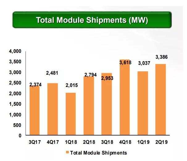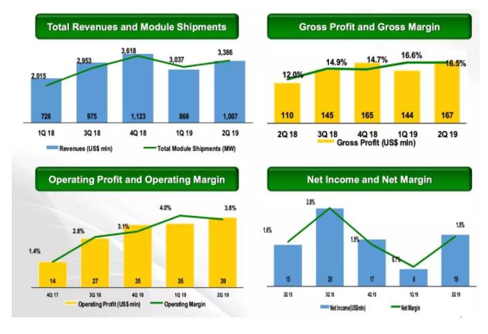 ◎ 太陽能組件總出貨量為3,386兆瓦,相比2019年第一季度的3,037兆瓦(包括集團(tuán)內(nèi)部的出貨量)增長11.5%,相比2018年第二季度的2,794兆瓦增長21.2%。